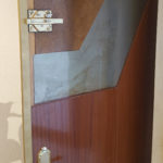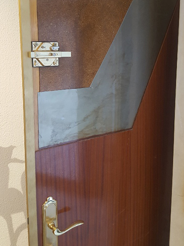 - La PUERTA es de madera e incorpora blindaje exterior e interior a través de chapas de acero de entre 6 y 8 décimas de espesor. El problema es que dichas chapas están simplemente pegadas a la puerta, por lo que no ejercen ninguna resistencia contra el apalancamiento, ni casi contra la realización de un butrón, ya que 6 u 8 décimas es tan fino que con un simple destornillador se atraviesa.