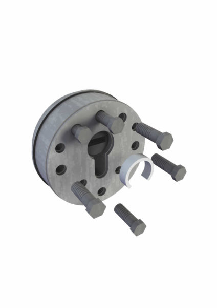- Unión compacta de escudo especial E2 fabricado por ROCONSA, cerradura central, cilindro y elementos de protección. Su intento de separación bloquea la cerradura