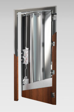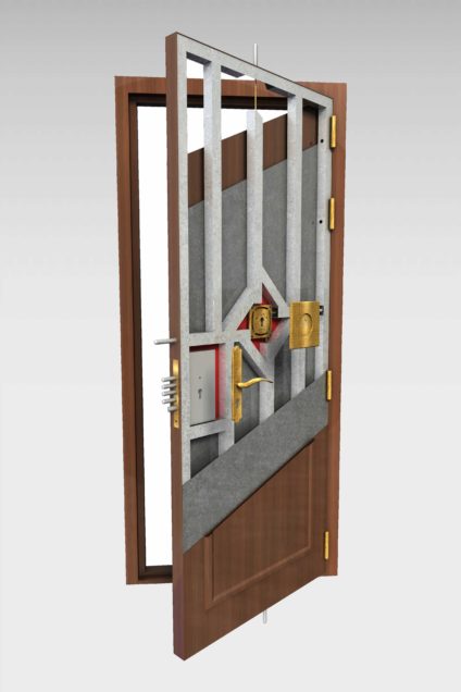 La estructura de la puerta que está reforzada con una cruceta interior que reparte cargas.