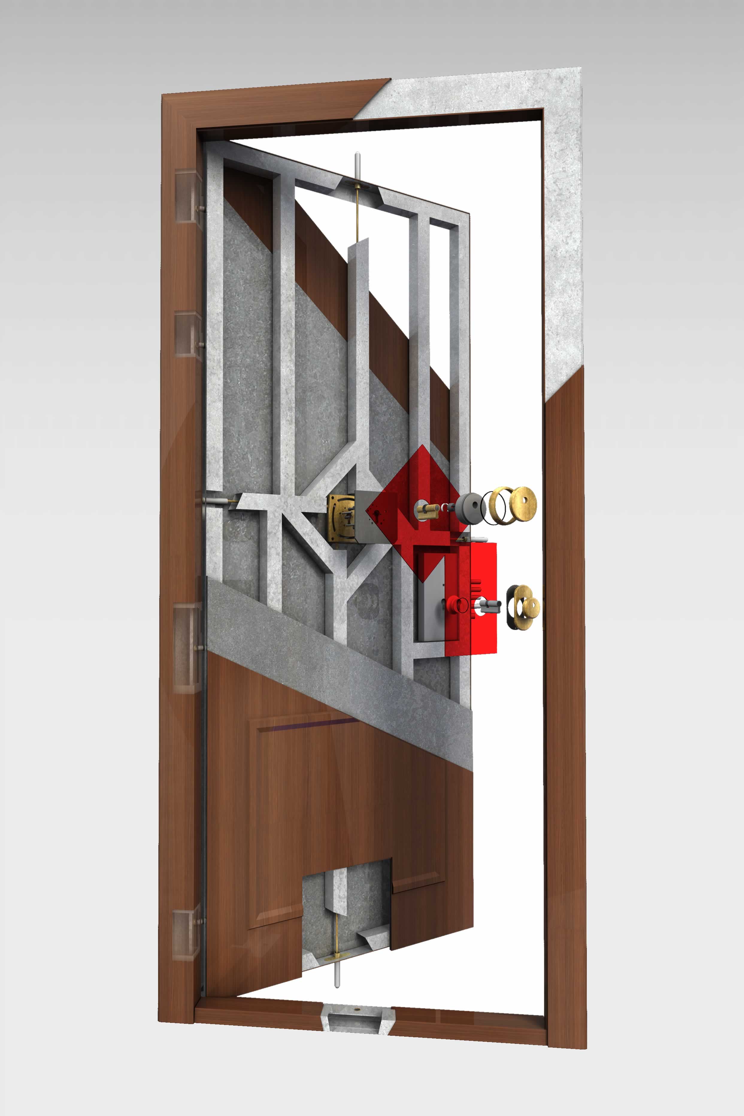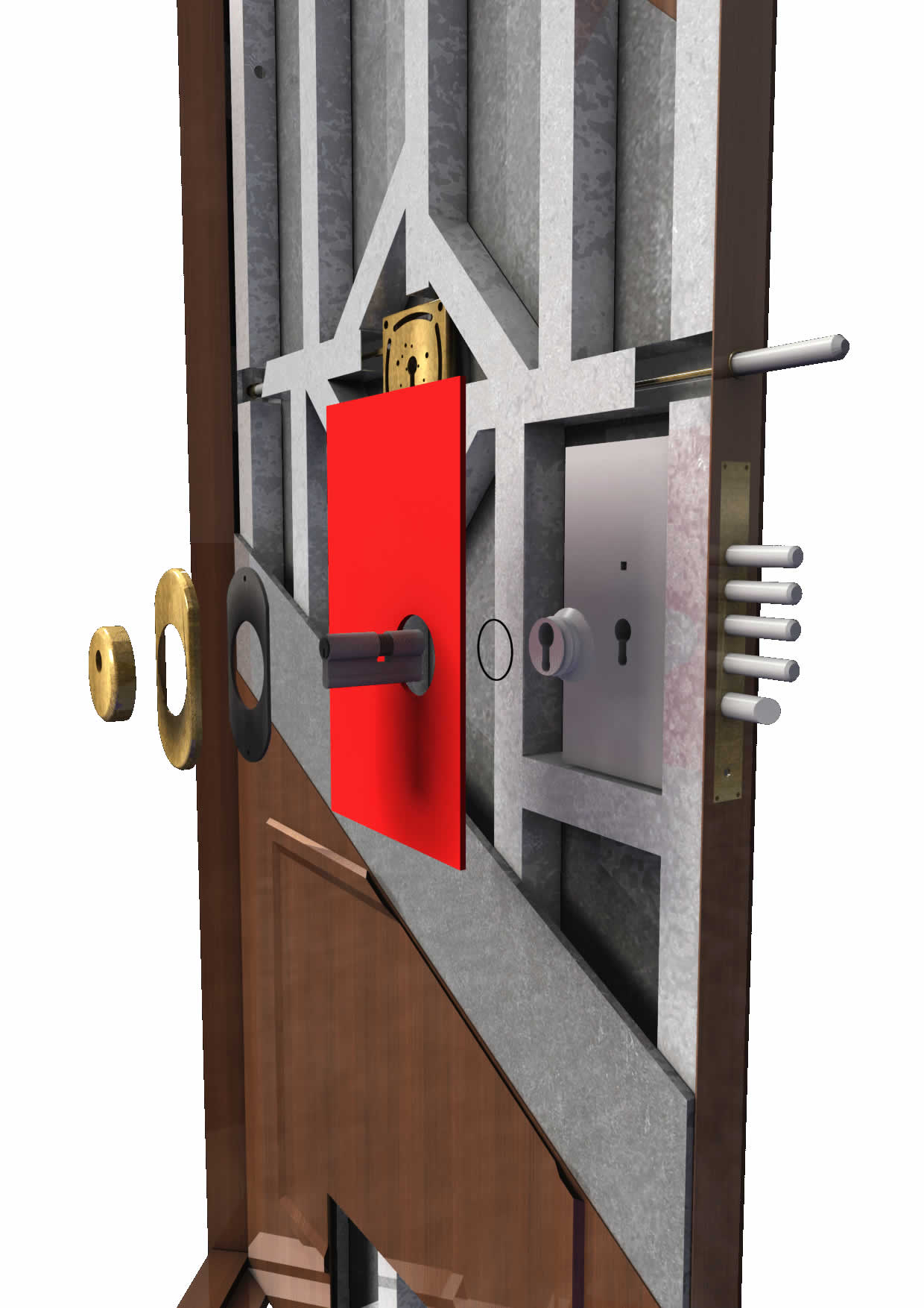 La cerradura central, que cierre en los 4 puntos cardinales de la puerta, penetrando los cerrojos 55mm y siendo cada punto independiente entre sí frente a taques entre marco y puerta.